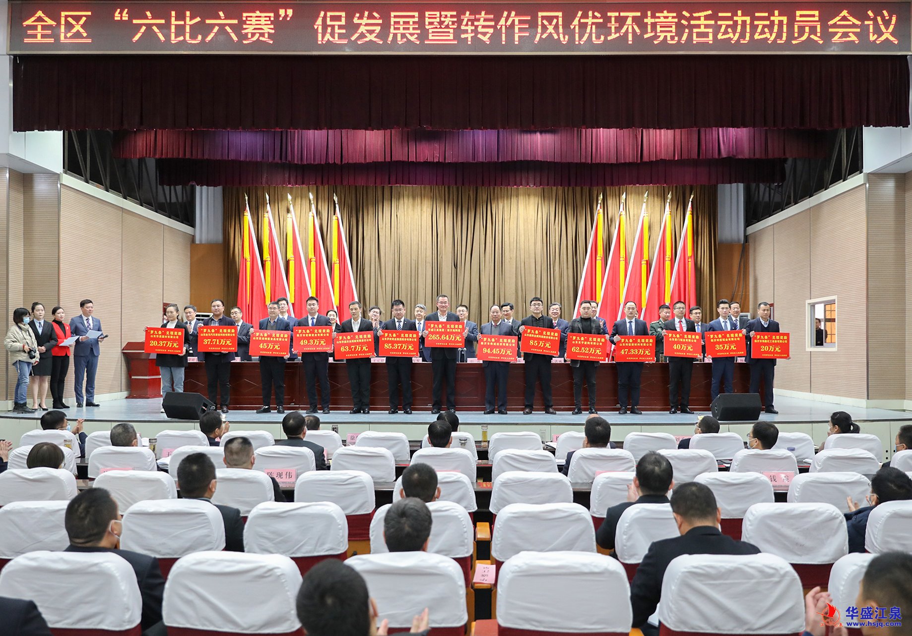 2月10日,羅莊區“六比六賽”促發展暨轉作風優環境活動動員會議召開,動員全區上下牢固樹立“項目為王、企業至上”的理念,一切圍繞企業轉,一切盯著項目干,努力跑出項目建設“加速度”,打造營商環境“金招牌”,展現作風建設“新氣象”,推動全區經濟社會高質量發展。為表揚先進、樹立典型,羅莊區委、區政府對2021年度具有特殊貢獻的先進企業進行了表彰。在此次受表彰的全區15家“2021年度龍榜企業”中,華盛江泉集團榮登榜首。沈泉莊黨委書記、華盛江泉集團常務副總經理、財務總監張毅參加動員會議并上臺領獎。